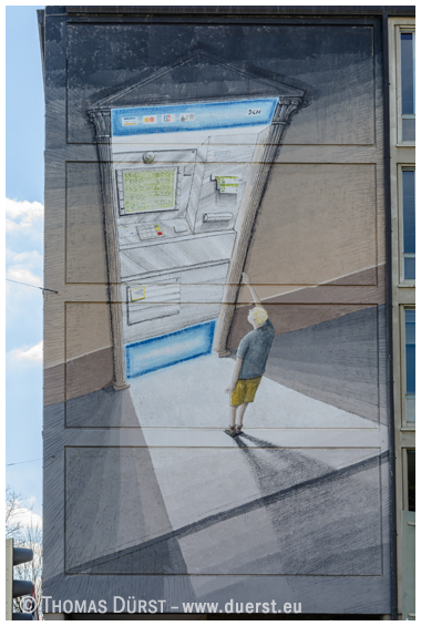![]() Urheber: BLU (Italien), 2015 Ort: München, Ecke Karl-/Luisenstraße Zum Werk: Diese Arbeit zeigt ein kleinen Menschen, der bereits in jungem Alter mit ausgestreckter Hand vor dem heiligen Tempel steht, um das „große Geld“ abzugreifen. (Quelle: Positive Propaganda e.V.). |