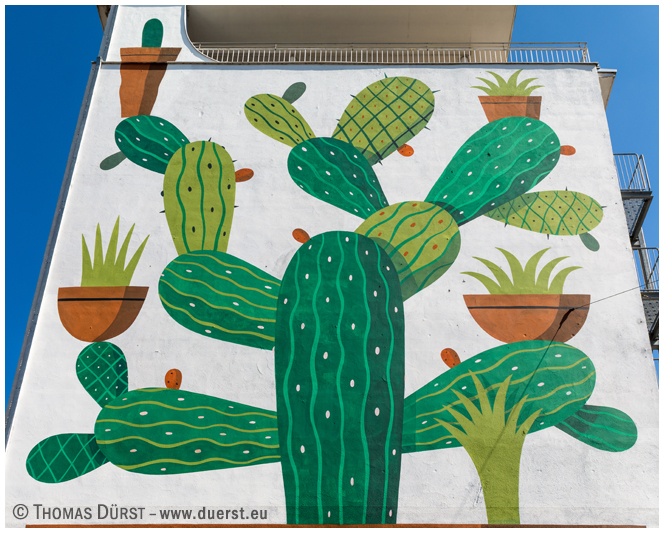 ![]() Urheber: Agostino Iacurci (geb. in Italien, lebt in Berlin), September 2017 Titel: Ficus indica Ort: München, Ecke Landsbergerstraße 20 / Max-Friedländer-Bogen Zum Werk: Opuntia ficus indica ist eine typische Pflanze der italienischen Region Apulien, in der Agostino geboren wurde (die Heimat dieses Kaktus ist allerdings Amerika, vermutlich México). Charakteristisch für seine Murals (weltweit mehr als 40) sind vereinfachte Formen. |