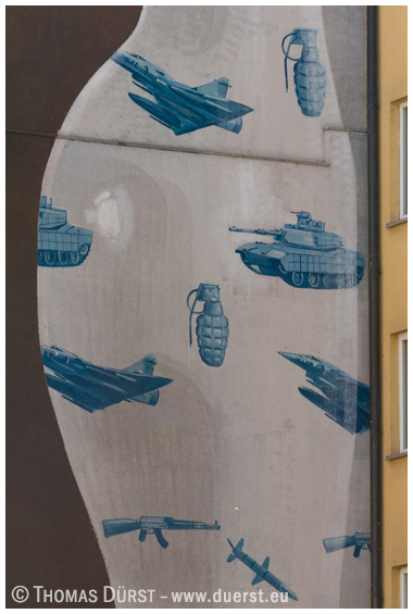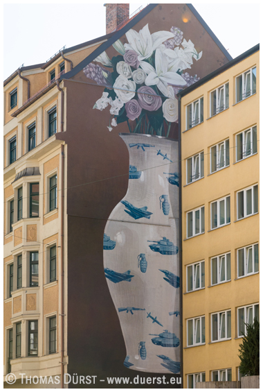 Urheber: ESCIF (Spanien), 2016 Titel: Durch die Blume gesagt Initiator: Stadt München (Bürgermeister Josef Schmid) / Positive Propaganda e.V. Ort: München, Paul-Heyse-Straße 20 Zum Werk: Das Bild bezieht sich auf die zahlreichen Flüchtlinge und den Zusammenhang ihrer Flucht mit Rüstungsexporten deutscher Firmen, von denen einige in München ansässig sind. Escif bemerkte (so sagt man) bei seinem Besuch in München viele Blumen, so dass er seine Kritik an den Rüstungsexporten sozusagen „durch die Blume“ anbrachte. Quelle: |