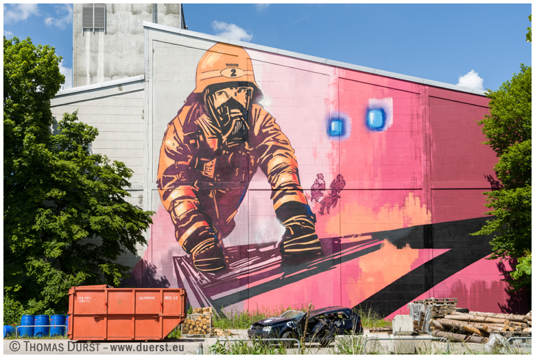 ![]() Urheber: Buntlack Team, Sommer 2018 ohne Titel Ort: Feuerwache 2, München-Sendling; an der Boschetsrieder Straße, Nähe Ratzingerplatz Zum Werk: Im Auftrag der Feuerwehr München; 250 Quadratmeter; 22m breit und 15m hoch |
